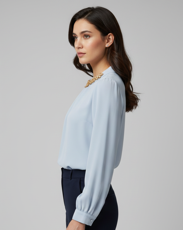 Crafted in a smooth, fluid fabric with a soft, slip-like drape, this formal top offers effortless elegance with a refined finish. The delicately embellished neckline adds just the right touch of detail, elevating the look while keeping it polished and professional. Light on the skin and graceful in movement, this piece is designed for long workdays and formal moments that call for subtle luxury.